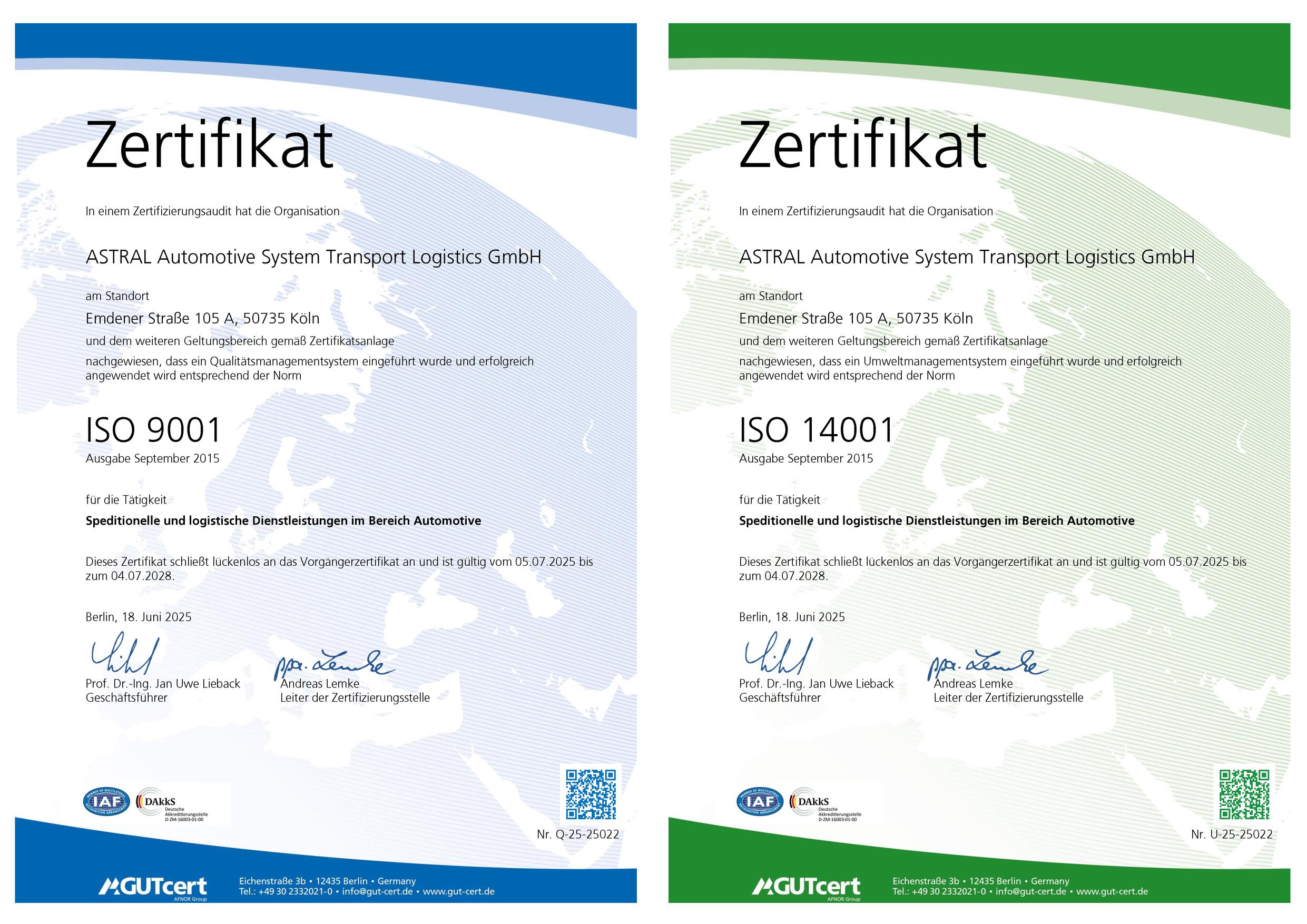 In der Logistik zählt nicht nur perfektes Timing. Für eine optimale Wertschöpfung ist auch die Qualität aller Logistikprozesse entscheidend. Zum Beleg für den ausgezeichneten Wert unserer Leistungen wurde das Qualitätsmanagement von Astral nach DIN EN ISO 9001 und ISO 14001 zertifiziert.
