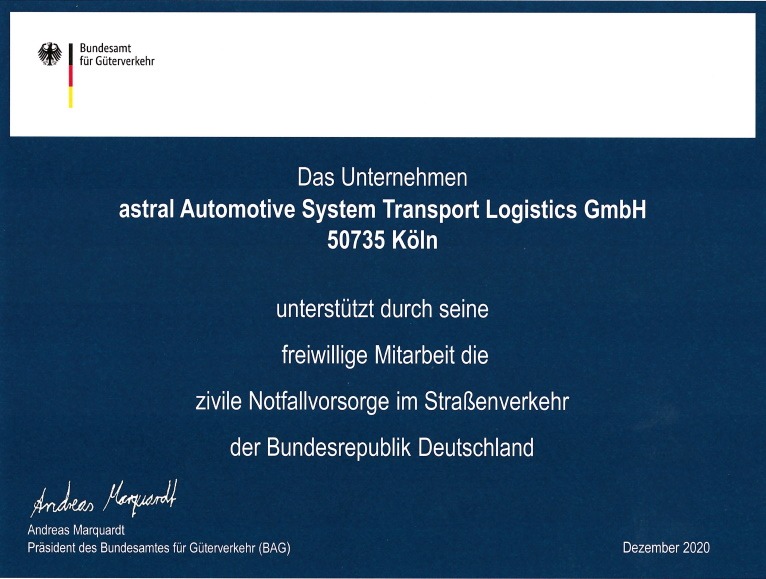 Astral ist auch in Krisensituationen in Sachen Versorgung ein beständiger Ansprechpartner.Im Dezember 2020 wurden wir vom Bundesamt für Güterverkehr für die Bereitschaft zur Mitwirkung in der zivilen Notfallvorsorge im Straßenverkehr ausgezeichnet. Somit ist unser Unternehmen als Grundversorger eingestuft.